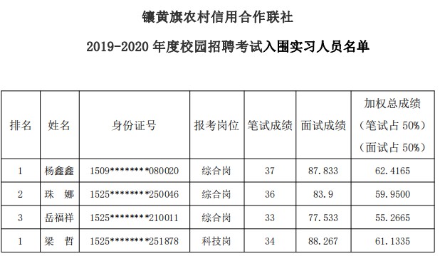 根據(jù)內蒙古自治區(qū)農村信用社聯(lián)合社內農信發(fā)〔2019〕765 號文件精神要求,結合鑲黃旗農村信用合作聯(lián)社實際招聘計劃,根據(jù)考生參加兩輪考試的筆試成績和面試成績,按照筆試與面試 5 :5 的比例加權計算總成績(考試總成績=筆試成績×50%+面試成績×50%),現(xiàn)將鑲黃旗農村信用合作聯(lián)社 2019-2020 年應屆高校畢業(yè)生校園招聘考試實習入圍人員名單進行公示,公示時間為 5 個工作日,自2019 年 12 月 11 日至 2019 年 12 月 17 日。請登錄內蒙古才路人力資源服務有限公司官網(wǎng)(http://www.clqygl.com/)查看。咨詢電話:0471-3307904。