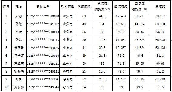 根據(jù)內(nèi)蒙古自治區(qū)農(nóng)村信用社聯(lián)合社內(nèi)農(nóng)信發(fā)〔2019〕765號(hào)文件精神要求,結(jié)合蘇尼特右旗農(nóng)村信用合作聯(lián)社實(shí)際招聘計(jì)劃,根據(jù)考生參加兩輪考試的筆試成績(jī)和面試成績(jī),按照筆試與面試5 :5 的比例加權(quán)計(jì)算總成績(jī)(考試總成績(jī)=筆試成績(jī)×50%+面試成績(jī)×50%),按照招聘崗位1:1的比例由高到低確定入圍實(shí)習(xí)人員,現(xiàn)將蘇尼特右旗農(nóng)村信用合作聯(lián)社2019-2020年應(yīng)屆高校畢業(yè)生校園招聘考試實(shí)習(xí)入圍人員名單進(jìn)行公示,公示時(shí)間為5個(gè)工作日,自2019年12月11日至2019年12月17日。請(qǐng)登錄內(nèi)蒙古才路人力資源服務(wù)有限公司官網(wǎng)(http://www.clqygl.com/)查看。咨詢(xún)電話(huà):0471-3307904。