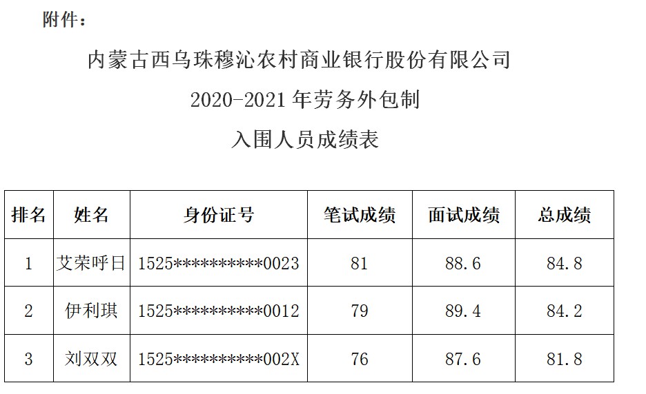 內(nèi)蒙古西烏珠穆沁農(nóng)村商業(yè)銀行股份有限公司委托內(nèi)蒙古才路人力資源服務(wù)有限公司,組織完成了內(nèi)蒙古西烏珠穆沁農(nóng)村商業(yè)銀行股份有限公司2020—2021年勞務(wù)外包制招聘資格審查、筆試、面試工作。