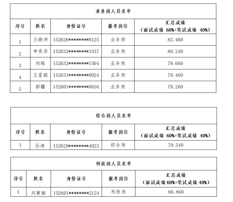 按照《察哈爾右翼后旗農(nóng)村信用聯(lián)社股份有限公司2022-2023年度應屆高校畢業(yè)生校園招聘工作實施方案》要求,考試總成績按照面試與筆試6:4的比例加權(quán)計算,并按照招聘崗位1:1的比例確定入圍人員,現(xiàn)將入圍名單及有關(guān)事宜公示如下: